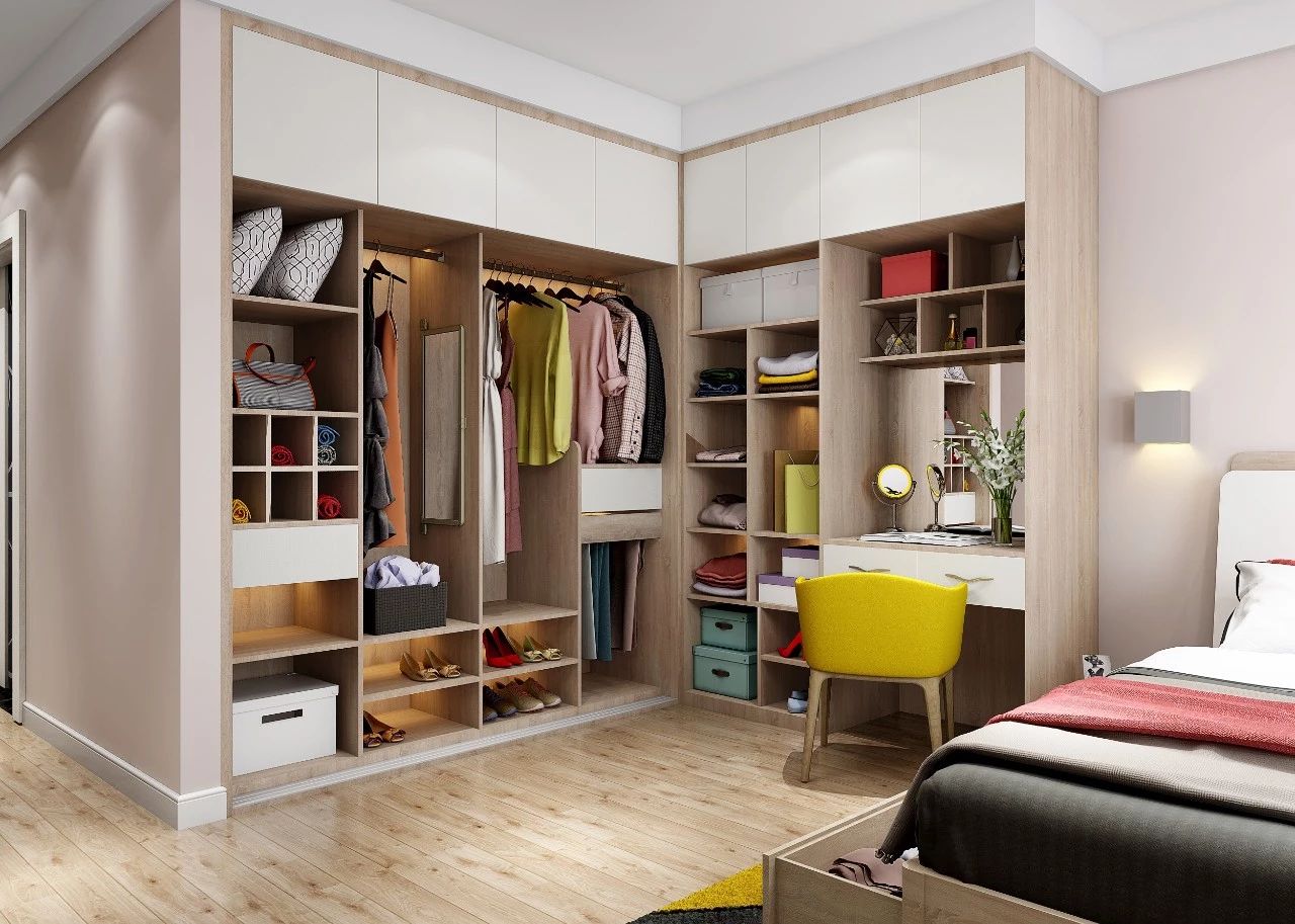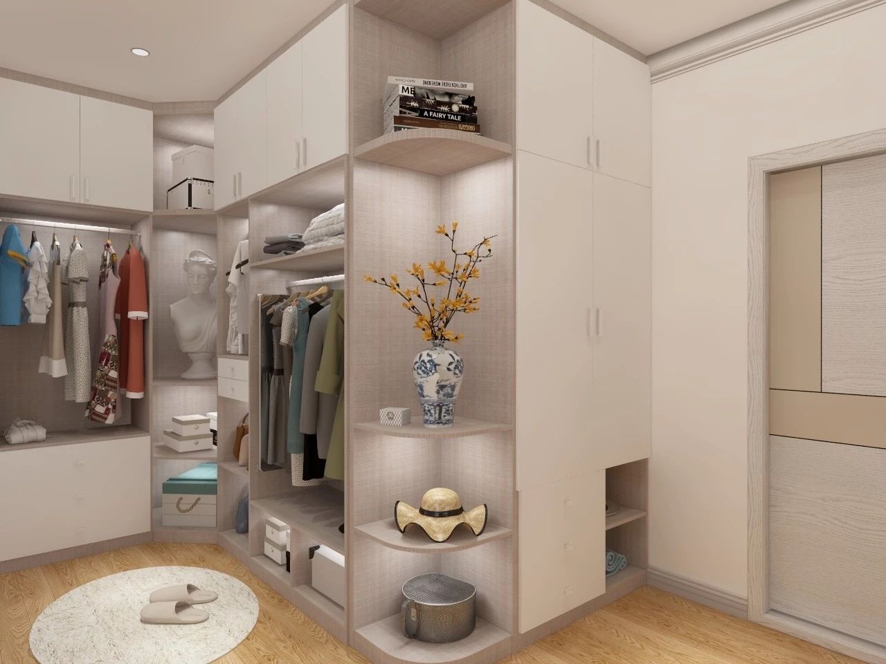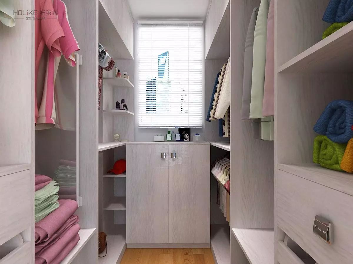 嵌入式衣帽间不需要独立的封闭空间,只要在家里找出一块面积在4㎡以上的空间,依据空间形状,制作几组柜体和内部间隔即可。
