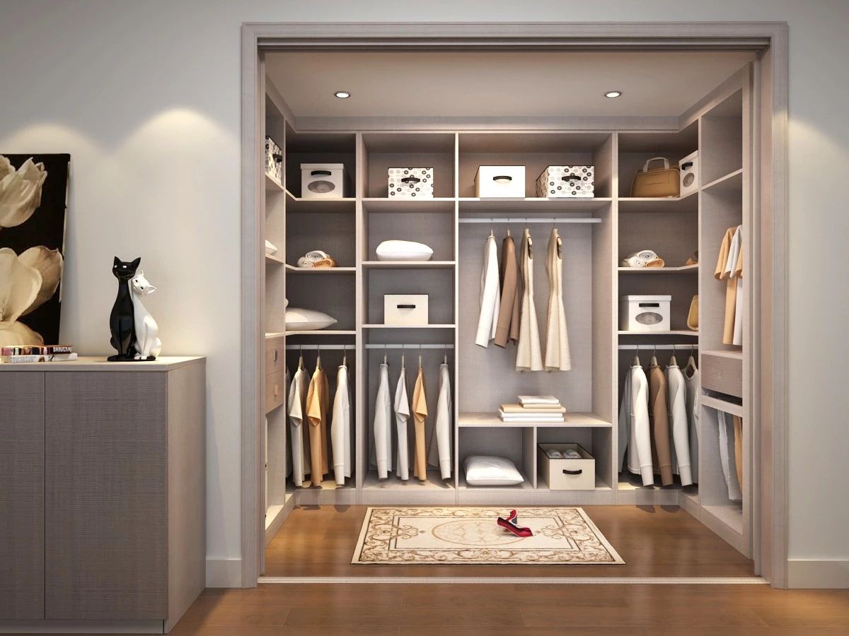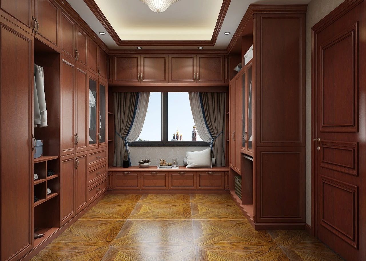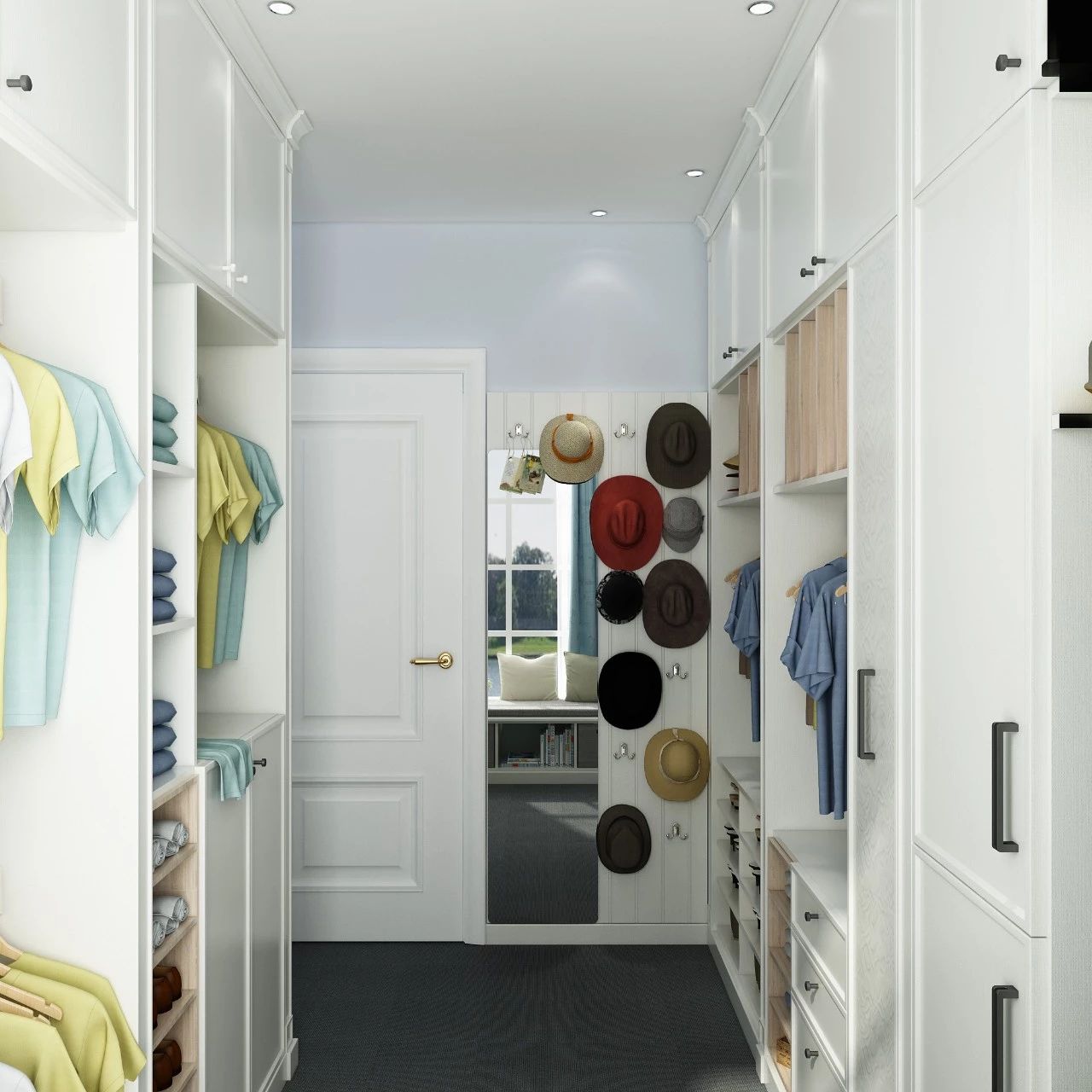 嵌入式衣帽间不需要独立的封闭空间,只要在家里找出一块面积在4㎡以上的空间,依据空间形状,制作几组柜体和内部间隔即可。