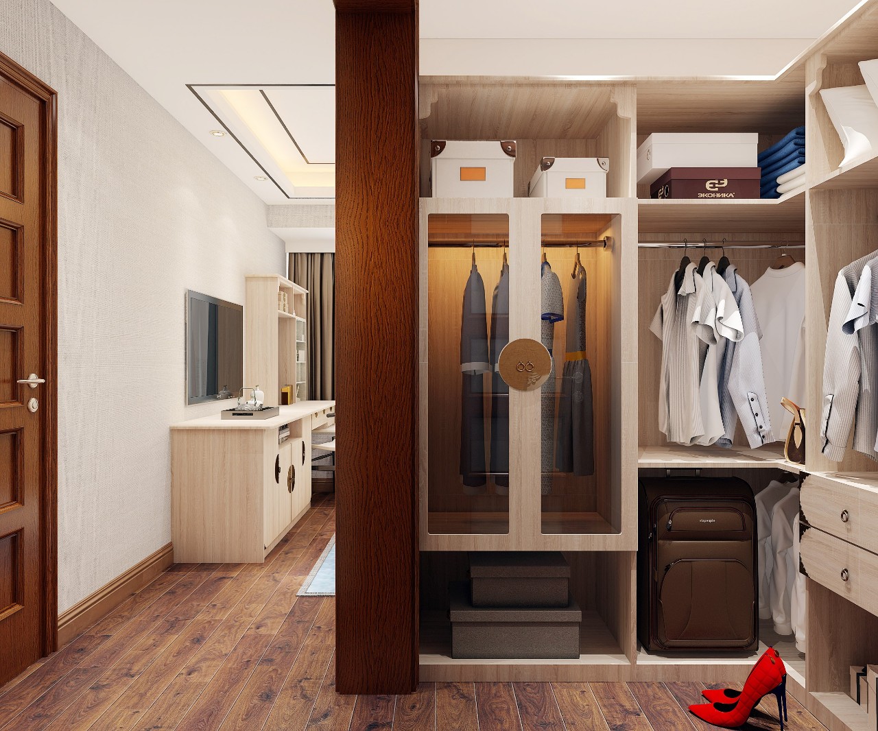 独立衣帽间的特点是防尘好,储存空间完整,还能提供充裕的更衣空间,但房间内要注意做好充足的照明。