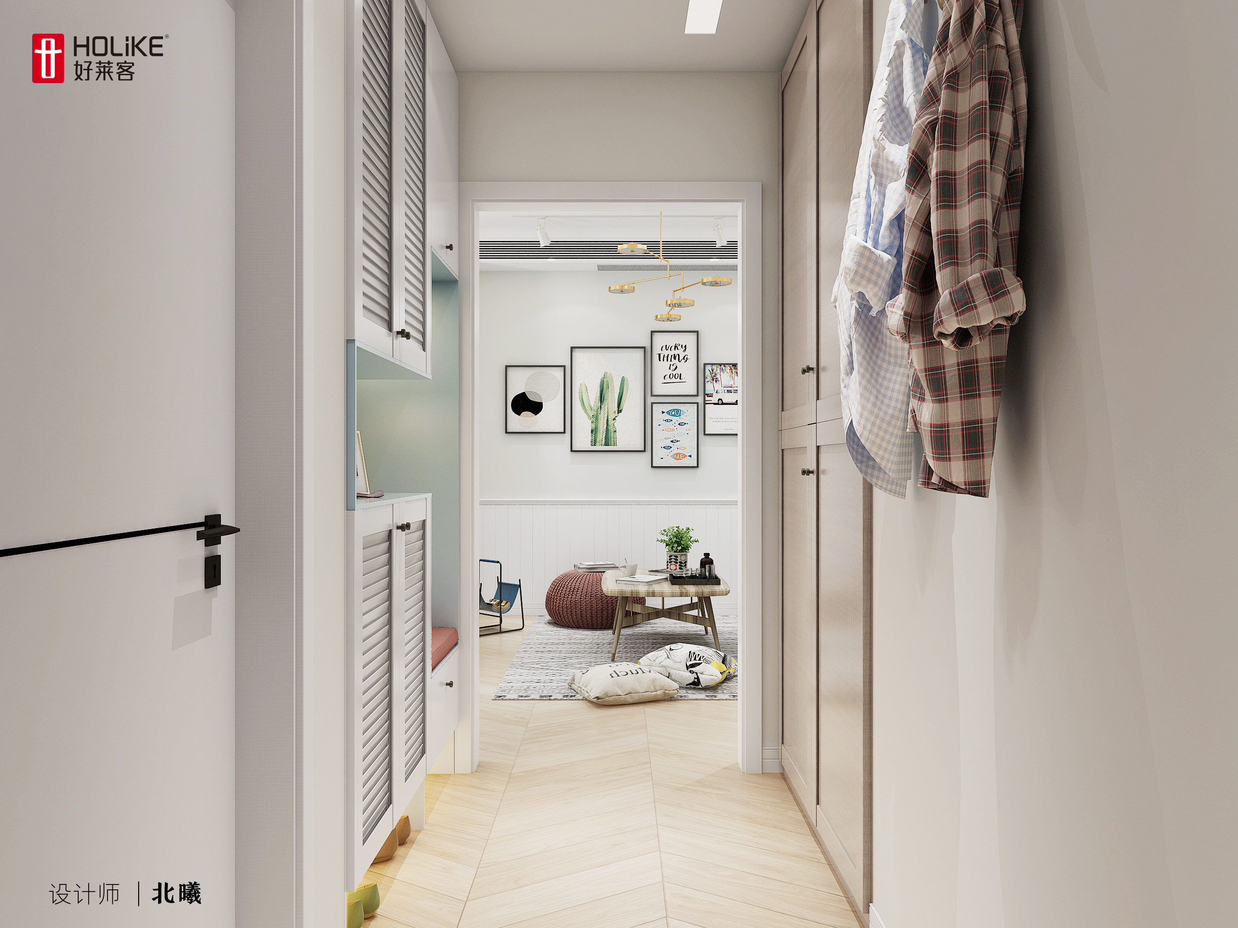 2. 门厅墙体改造、借用次卧的空间,增加了玄关的衣帽间、鞋柜、储物间等功能