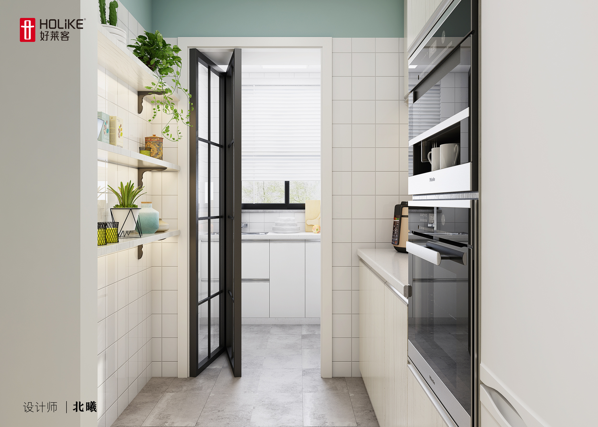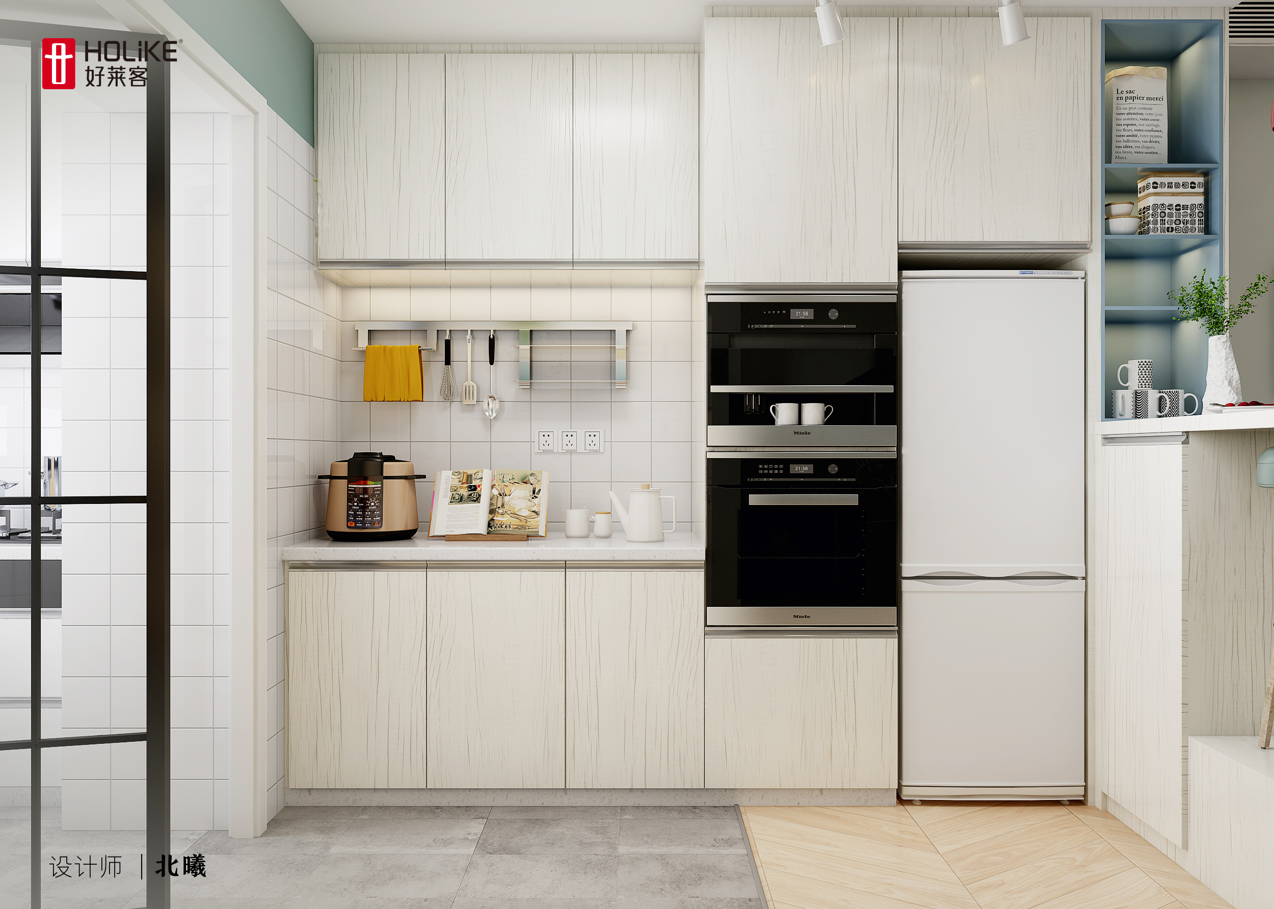 西厨区域以整面的浅色橱柜构成,内嵌烤箱、微波炉,也预留了冰箱位置,夫妻二人每天的元气早餐都能在这里轻松完成。