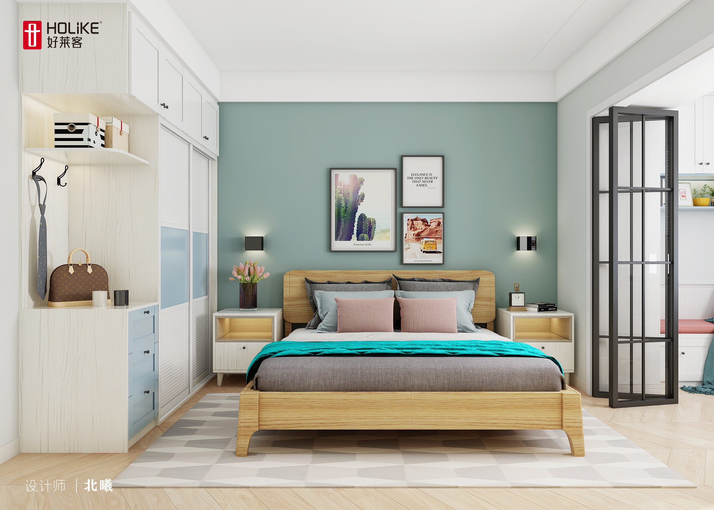 主卧是个带阳台的小套间,豆绿色的背景墙很舒缓,让人心态平静,更容易入睡。床的两边留空,各带一个床头柜,夫妻其中一方起夜,或加班晚回,也不会打扰对方。