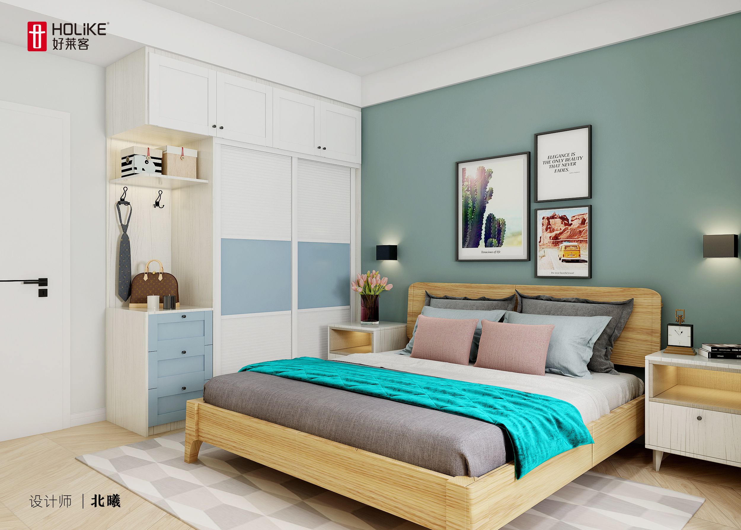 1. 全屋采用北欧原木+米色/白色柜体,搭配深浅豆绿+米色的背景墙,打造清新北欧风
