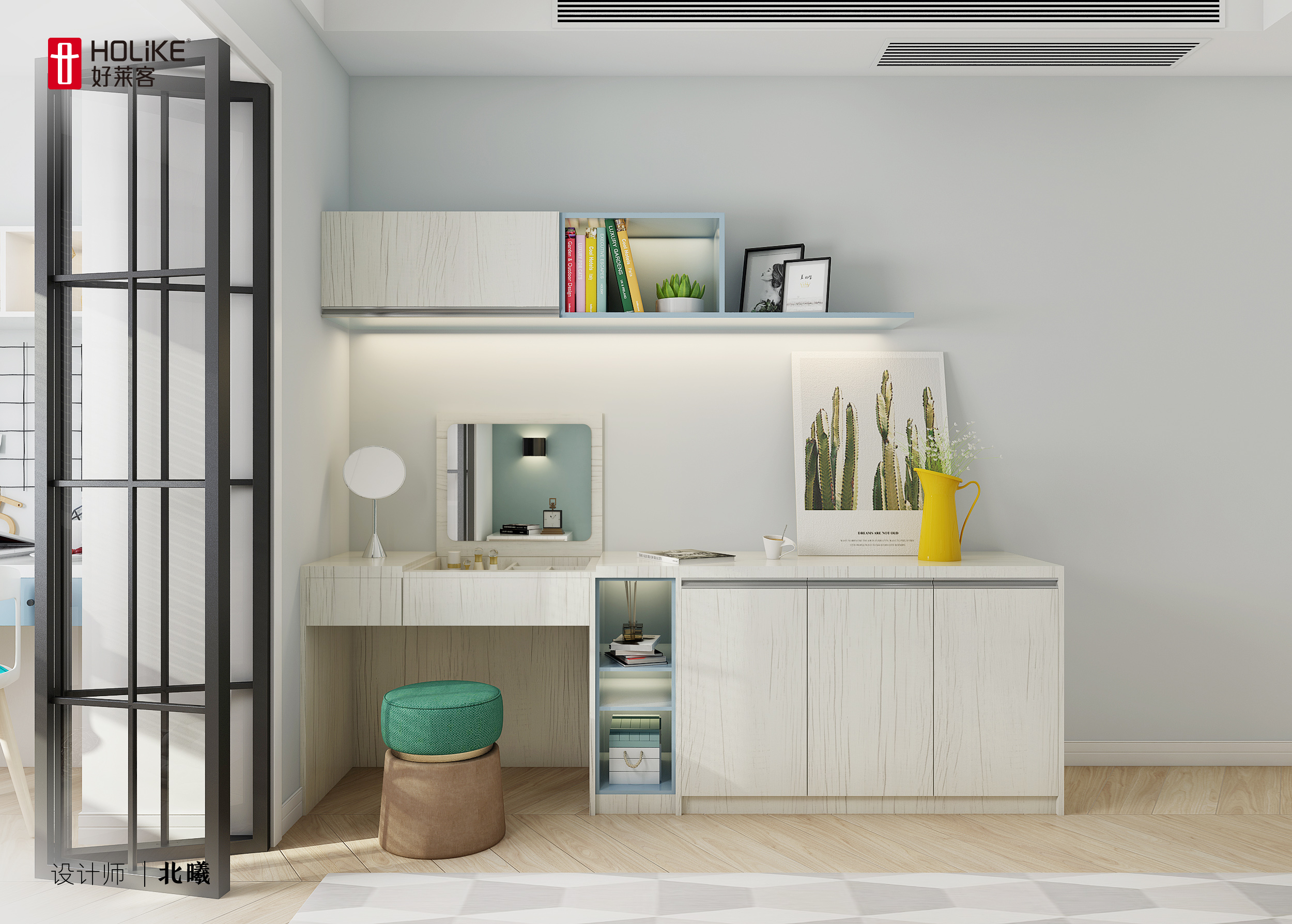 床尾做了翻盖带镜梳妆台组合储物柜,老婆既可以在这梳妆也可以在这办公。