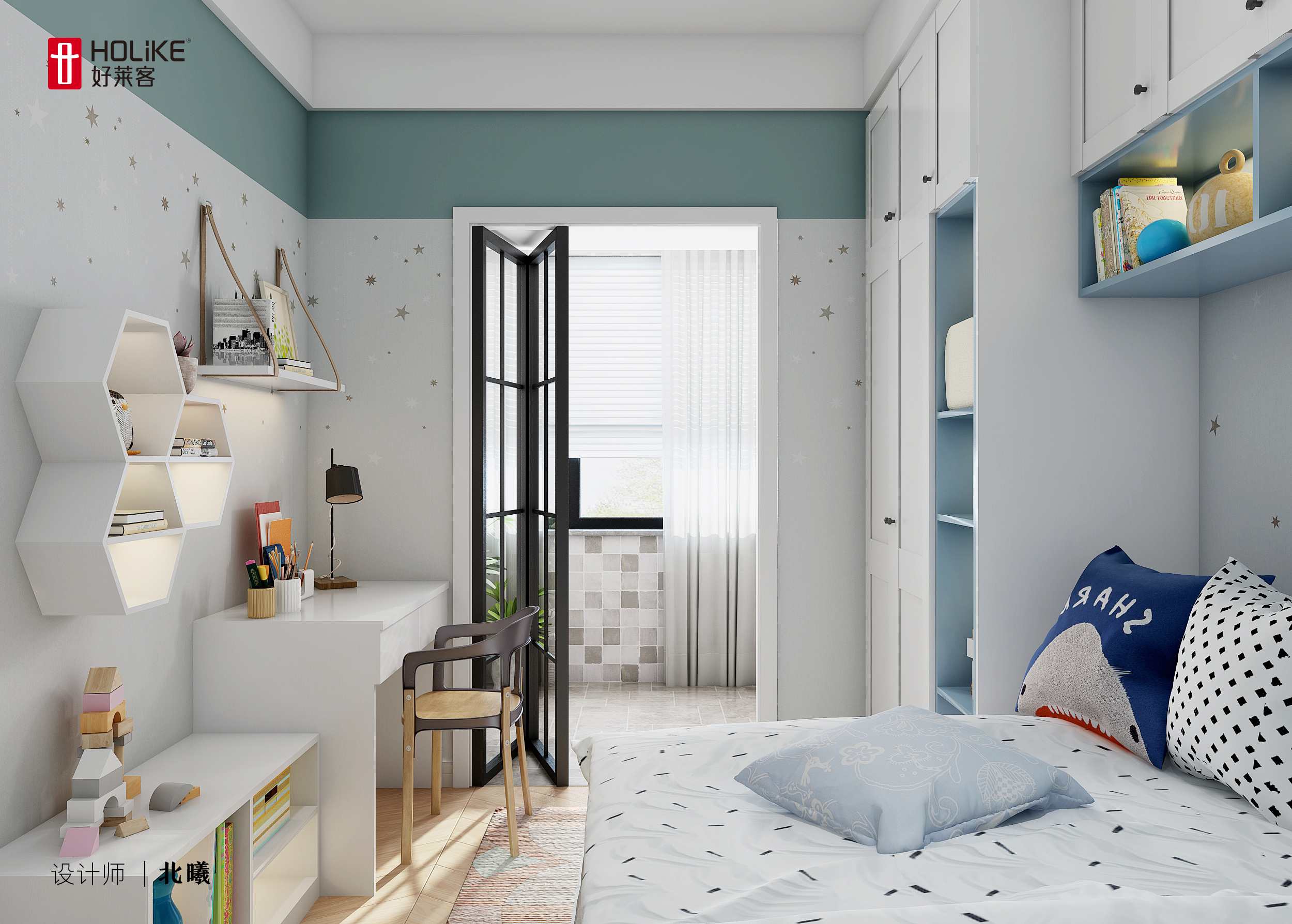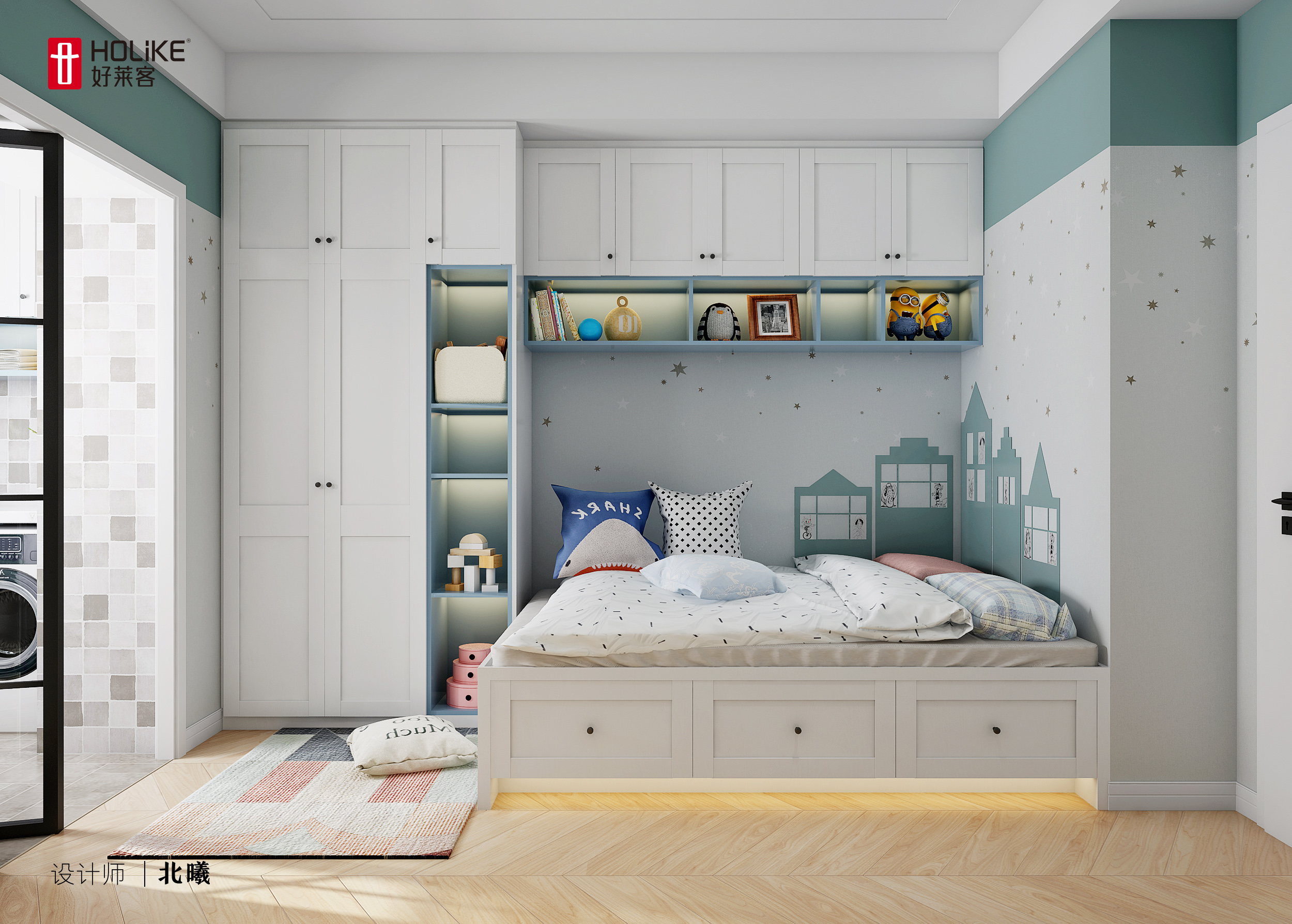 虽然还没要小孩,但儿童房已经提前准备好啦。次卧因为有一部分借给了玄关,因此使用到顶衣柜+吊柜+榻榻米定制家具组合柜来增加储物空间,靠近榻榻米的一圈采用开放式储物,方便拿取常用物品。