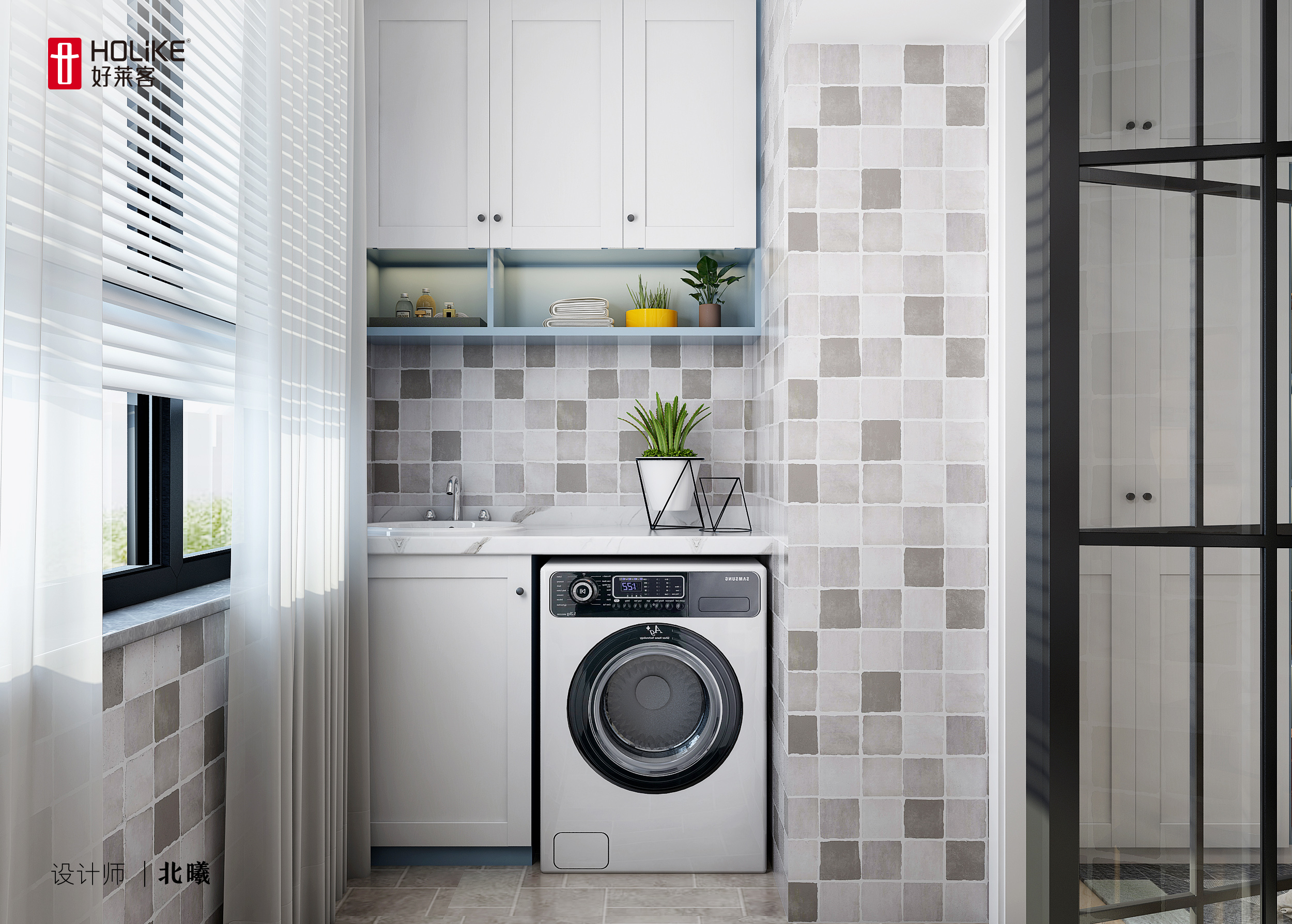 利用次卧阳台靠近卫生间的位置优势,在水电改造时对给排水进行调整,将洗衣房功能放置到次卧阳台;定制柜满足了洗衣机和手洗池功能需求。