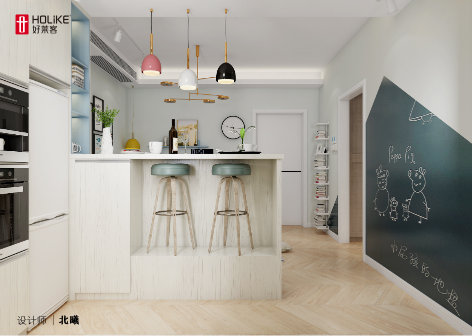 3. 调整厨房布局打造中西厨;多功能吧台同时兼顾了餐厅区域和电视柜功能